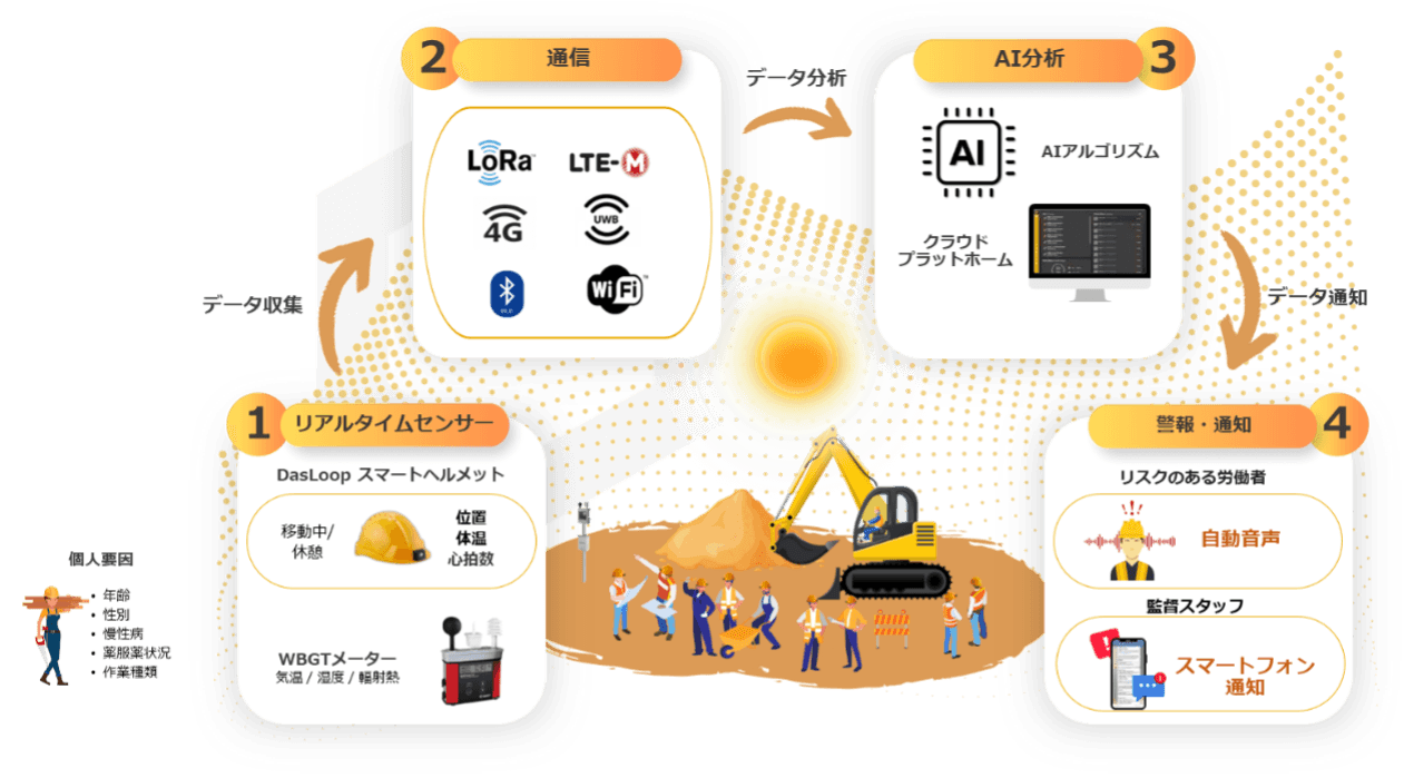 その一環として開発中なのが、AIによる熱中症予防システムだ。作業員の体調データをAI解析し、熱中症になる前に警告を発する仕組みで、深部体温センサーをヘルメットに組み込むことで精度を高めても装着時の負担を抑える工夫を凝らしている。