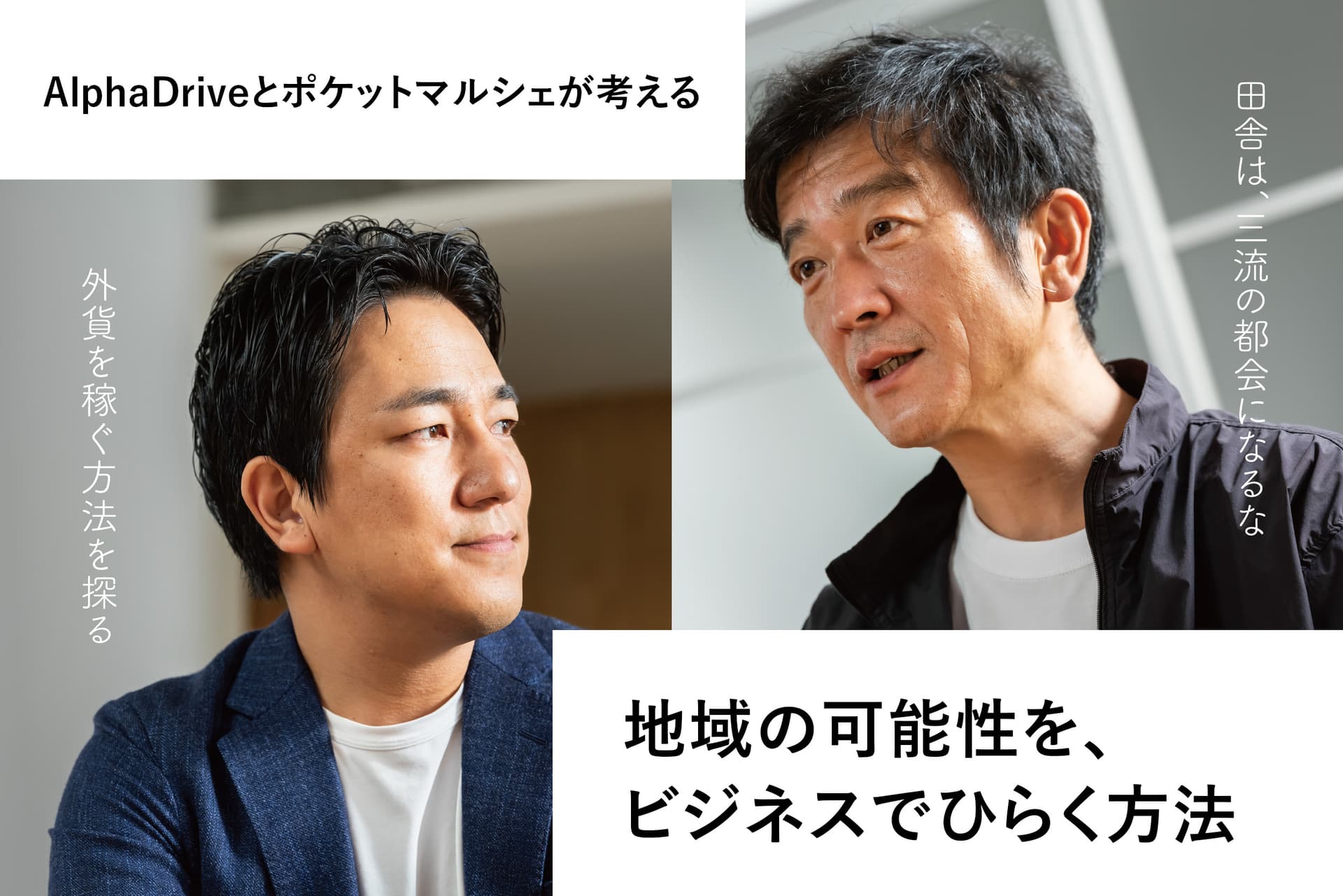 「地方創生」が叫ばれて10年、全国各地でさまざまな支援や取り組みが行われてきた。しかし地域の人口減少は待ったなし。消滅の未来が現実味を帯びてきたエリアもある。 地域発展の鍵は何か。「食べる通信」「ポケットマルシェ」を通して、地域と都会をつないできた雨風太陽の高橋博之氏と、地域からビジネス創出を目指すAlphaDrive REGIONの宇都宮竜司氏の対談を届ける。