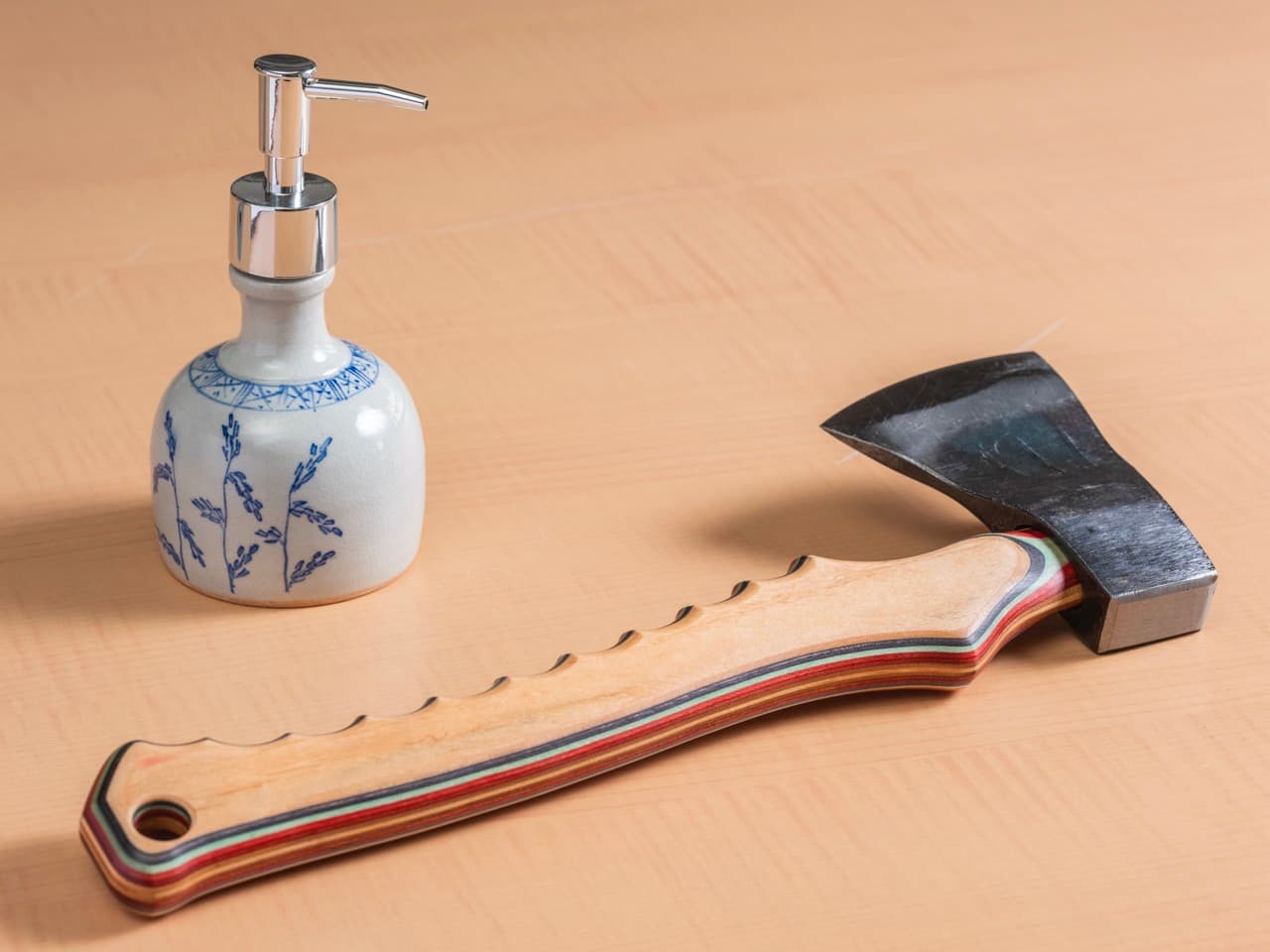 宇都宮 地域の資源を認識し、生かすこと。当たり前のようですがこれを大切にしています。当社は高知の職人さんたちと一緒に商品開発を行っています。ひとつの例がこの斧(写真参照)。刃の部分は「土佐打刃物」という伝統工芸品の職人さんが手掛け、束は高知県外の現代アーティストの方がスケートボードの廃材を使って制作、カバーを地元の革職人さんが担当しました。地域の素晴らしい伝統文化ですよね。しかし、ずっと地域の中にいると、互いの存在や価値に気づかないことがあるものです。それを見つけて、コラボレーションして、現代の価値にアップデートする。今後、このアイテムは首都圏や海外の富裕層に向けて販売していきます。地域のビジネスは、いかに域外から外貨を稼ぐかという点も大切です。