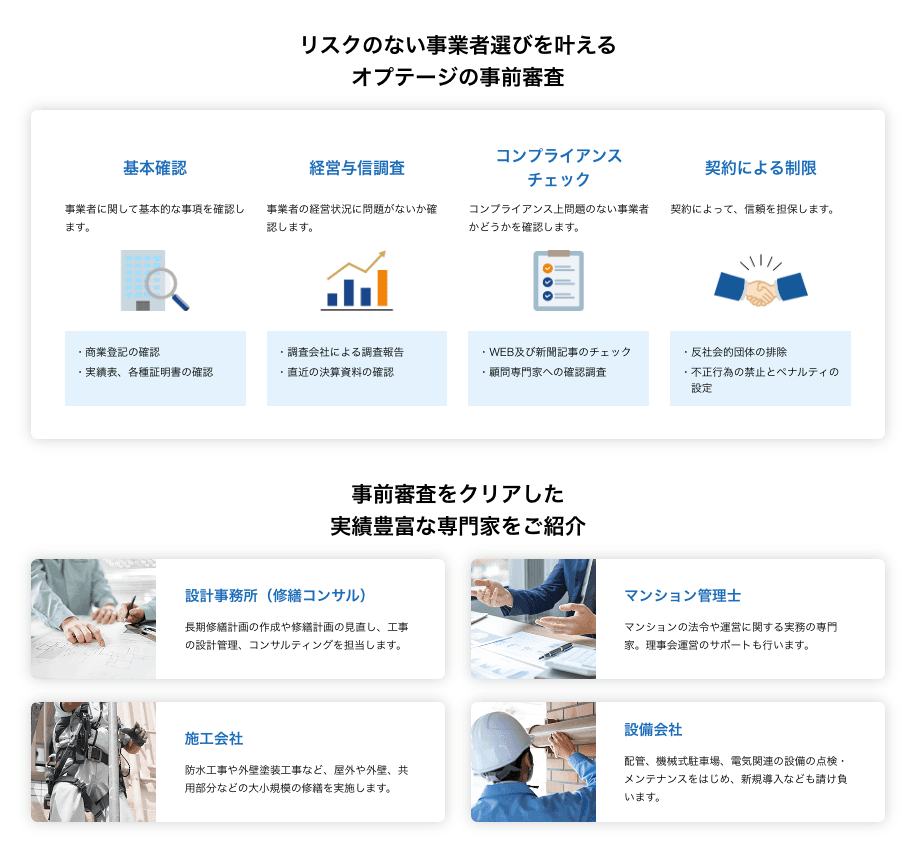 法人では、専門性が必要な事業におけるコンサルタントの活用が定着しつつありますが、一般の個人が高額なコンサルタント費用を支払って発注することは多くありません。しかし、マンション経営や大規模修繕工事においては、高度な専門性や意思決定材料の整理が必要なことも多いです。そのことから、コンサルタントや専門家とのマッチングも手がけている点が特徴の一つです。