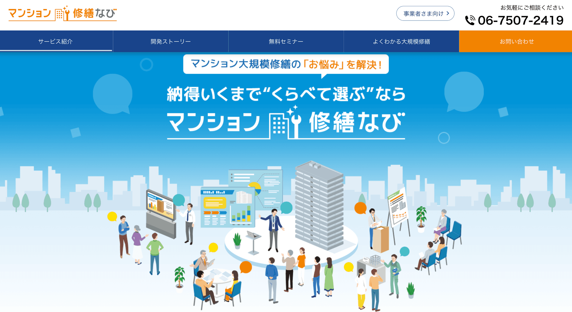 「マンション修繕なび」は、分譲マンションの所有者や賃貸マンションのオーナーなど、マンションの修繕に関するあらゆる悩みを抱える方に寄り添うサービスを展開しています。マンションの大規模修繕に関する情報提供や、信頼できる専門家のご紹介、適切な事業者の選定支援など、さまざまなサポートを行っています。