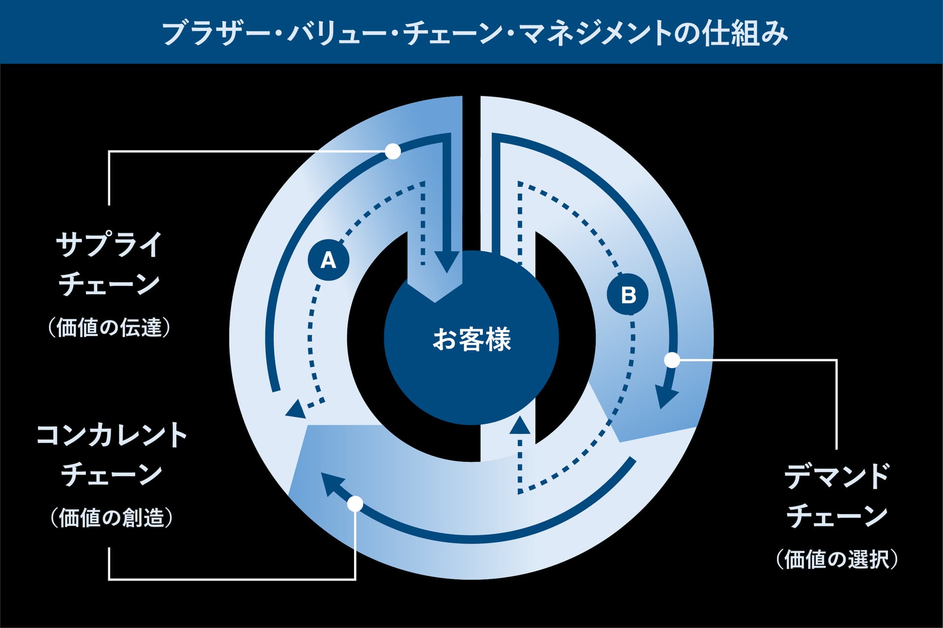 これは大きく3つのチェーンから成り立っています。ひとつ目は「デマンドチェーン」で、お客さまのニーズを把握し、それに対する弊社が提供すべき価値を決め、最適な価値の提供方法を立案するというもの。ふたつ目は「コンカレントチェーン」です。開発部門と製造部門、サプライヤーが連携を密にし、社内外の技術を組み合わせて価値を創り出します。最後が「サプライチェーン」。お客さまが求める価格で提供できるよう、不要なコストを抑えた生産、そしてきめ細かな販売・サービスを行うものです。