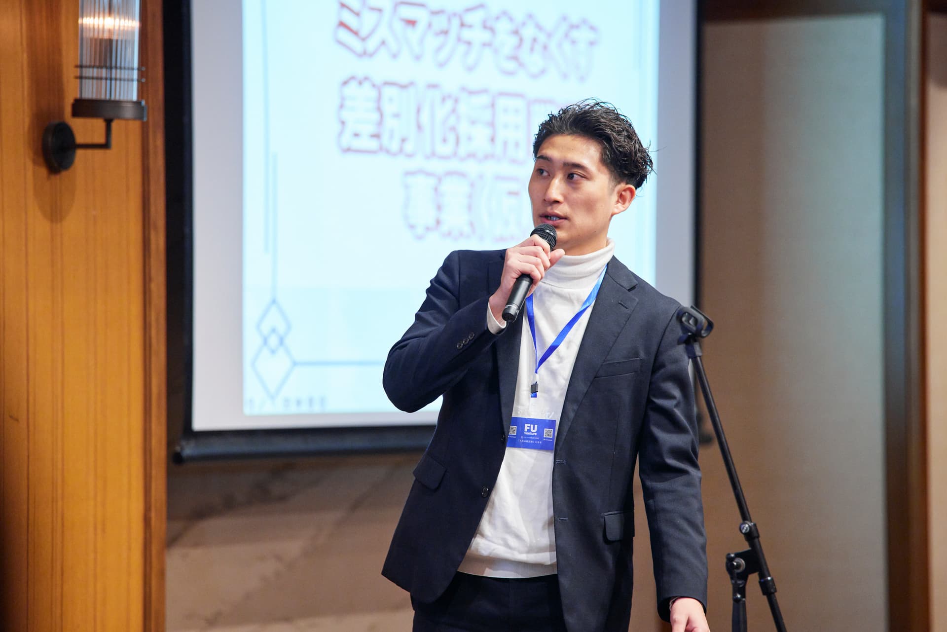 最後に、福岡大学の学生5名が考案したビジネスアイデアに会場参加者が投票する「学生の未来に一票」と題したコーナーを開催。最多票を集めたのは、中小企業の人材採用問題に着目し「ミスマッチをなくす、差別化採用戦略のサービス化」を提案した、経済学部産業経済学科の鶴田定士さんだ。福岡の未来を背負うリーダー人材として期待したい。