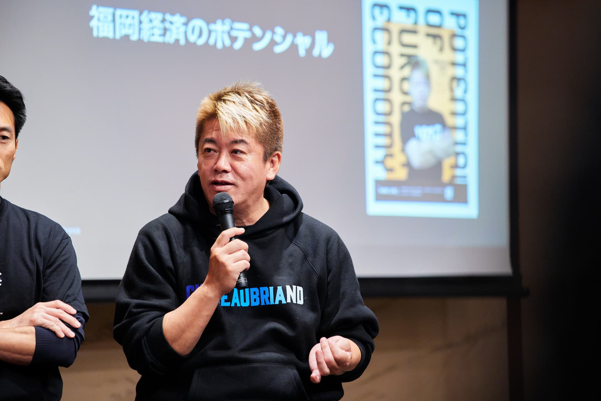 自身が出演する経済メディア『NewsPicks』のレギュラー番組『HORIE ONE』での収録を機に、あらためて福岡ビジネスの可能性に注目しているという堀江氏。集まった福岡のビジネスパーソンへ、“外からの視点”でその優位性とポテンシャルを語り、会場を盛り上げた。