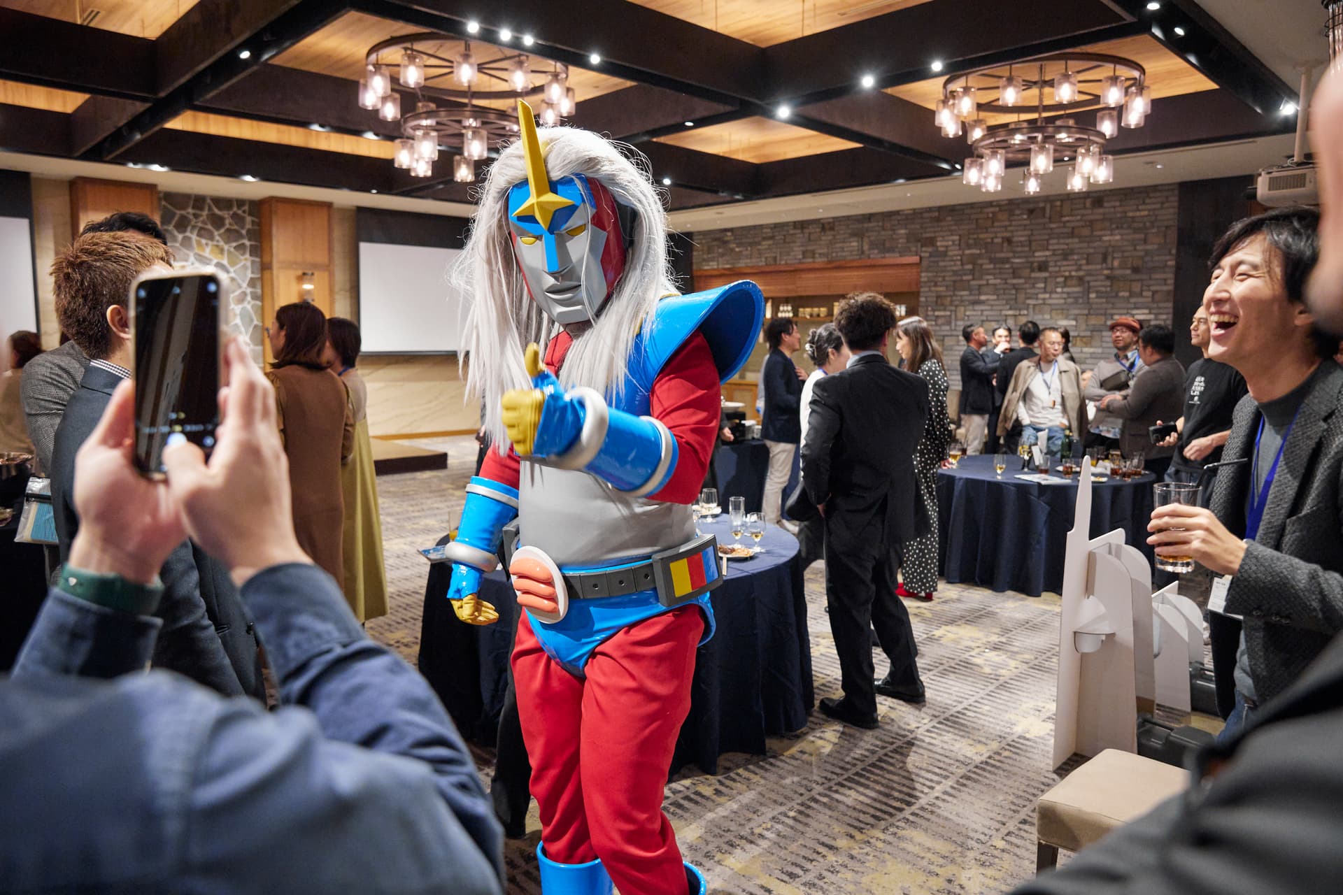 編集部メンバーが『Ambitions FUKUOKA』の見どころを解説したあとは、地元テレビ局のFBS福岡放送から生まれたご当地ヒーロー・バカチンガーが会場に登場。パネル前でのフォトセッションがスタートした。バカチンガーはテレビ局発の企画でありながら、そのネーミングから地上波番組への出演がNG。しかし、SNS上での活躍によりファンが増え続けている。