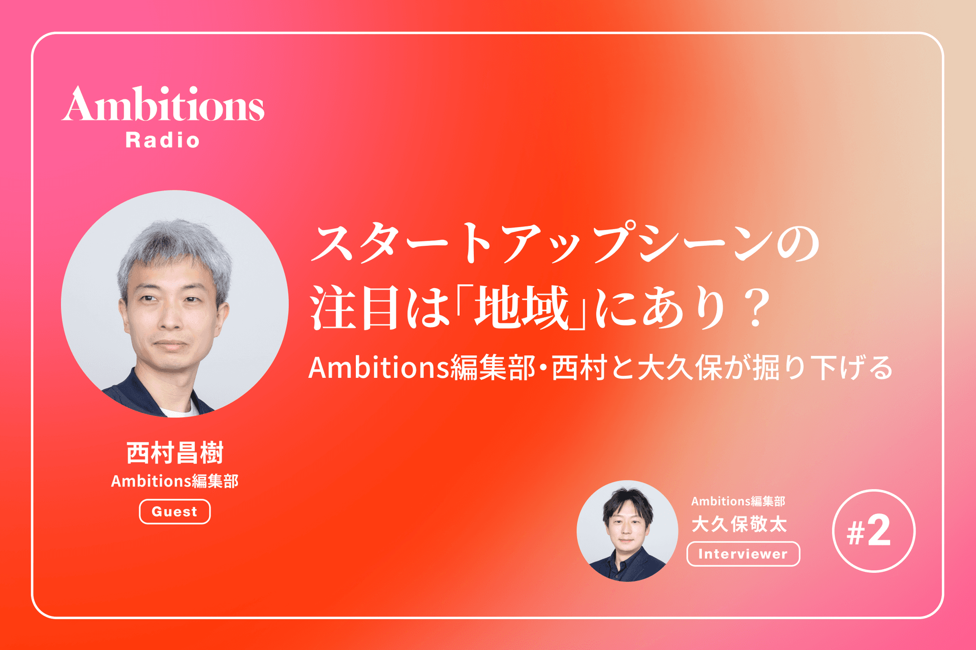 「Ambitions Vol.4」の発売を記念して、編集部メンバーによるPodcast番組を4話連続配信。 取材の裏話や誌面の狙いを、web限定でお届けします。 第2回は、地域経済にフォーカスした特集「地方は企む。」を担当した大久保敬太と、地域のスタートアップに精通する西村昌樹。今回のPodcastでは特に、全国各地で起き始めている、リージョナル・スタートアップシーンの最新動向について解説します。