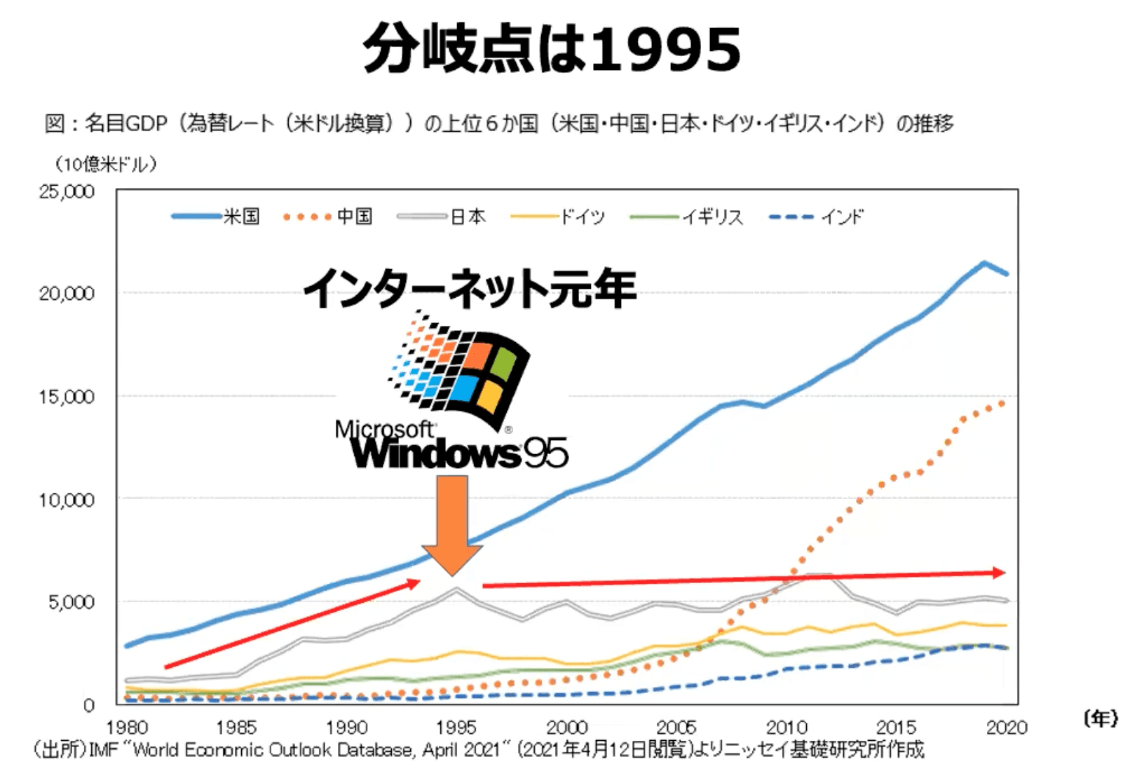 大きな要因として考えているのが、1995年の「Windows 95」の登場です(インターネット元年)。ここからアメリカではテックジャイアントが台頭するようになりましたが、一方の日本ではそのような企業を生み出すマインドをもつ人が圧倒的に少なかった。私はここに、日本とアメリカの差があったのだと思っています。