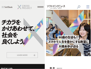 『X(クロス) PROJECT』トップページ(左)と、大橋未歩氏を起用した「スマホ教室」の記事(右)