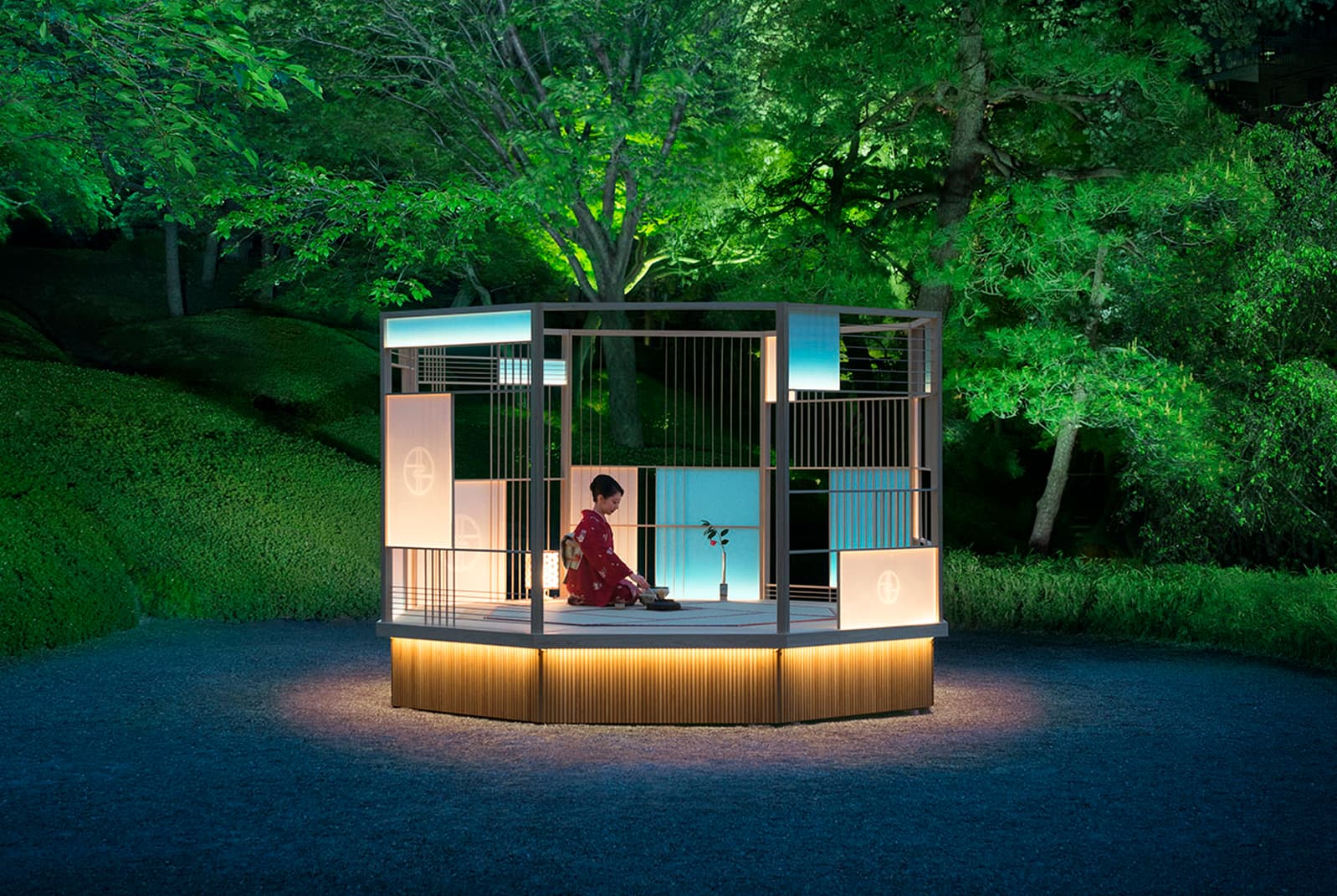 2017年には訪日外国人に向けた地域の魅力発信と観光の活性化のため、大川市と包括的連携協定を締結。大川の家具職人たちと開発したのは、今では八芳園のイベントに欠かせない組み立て式の茶室「無常庵-MUJYOAN-」。さまざまな場所に設置でき、使わないときに片付けられる、まるで家具のような画期的な移動式茶室。細かい木材を、釘を使わずに組んで作る精巧な表現技法「大川組子」も取り入れた。
