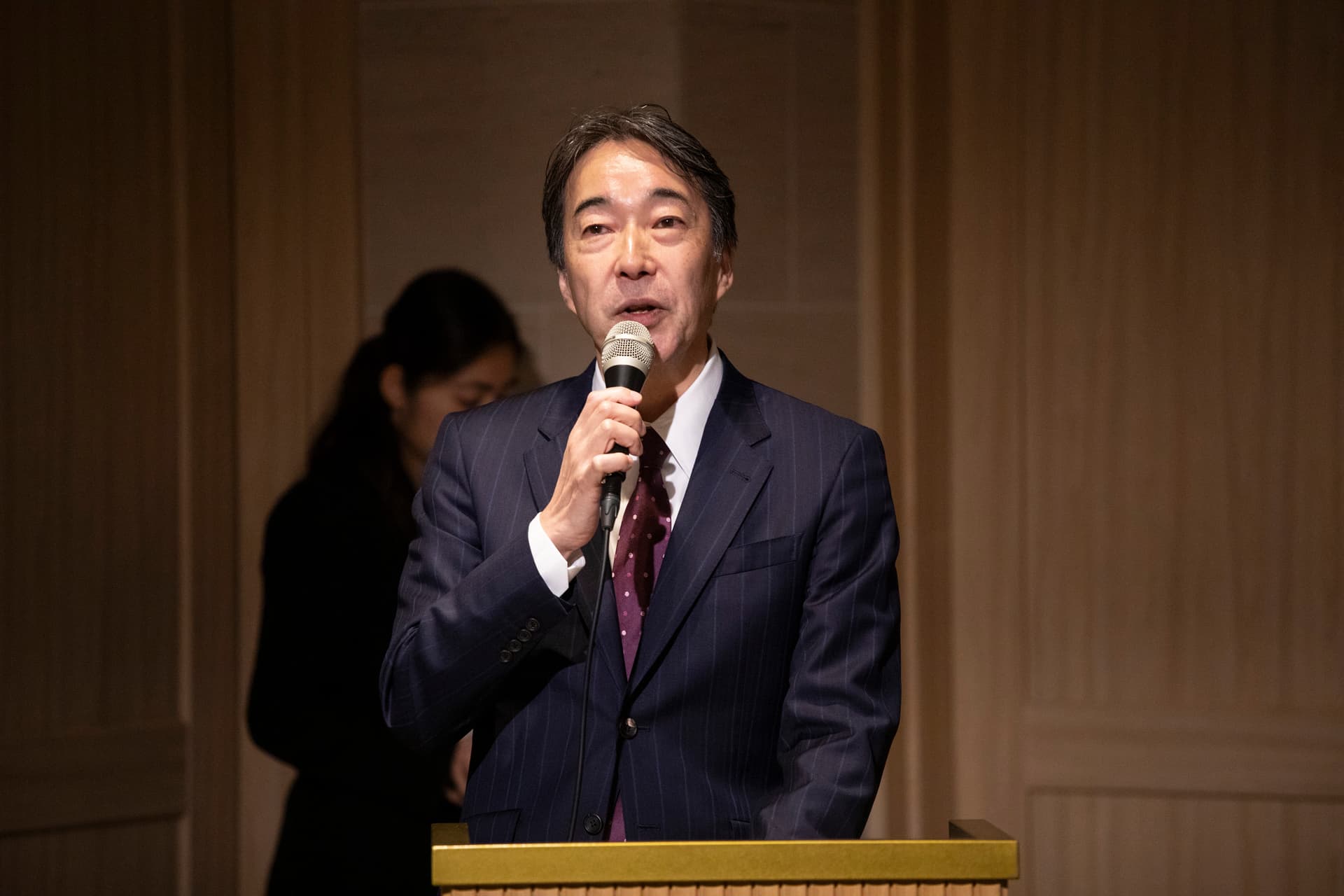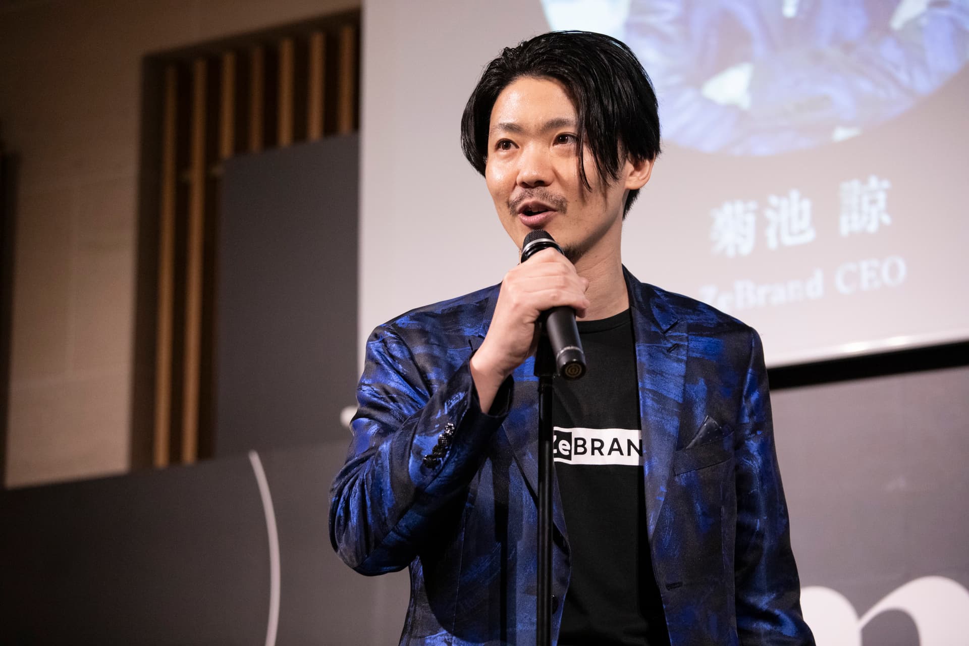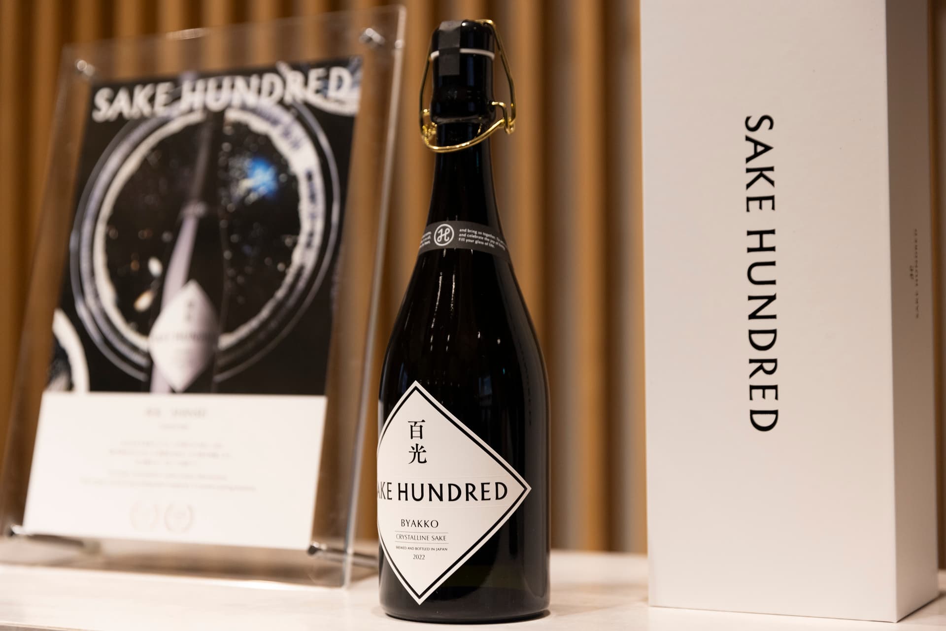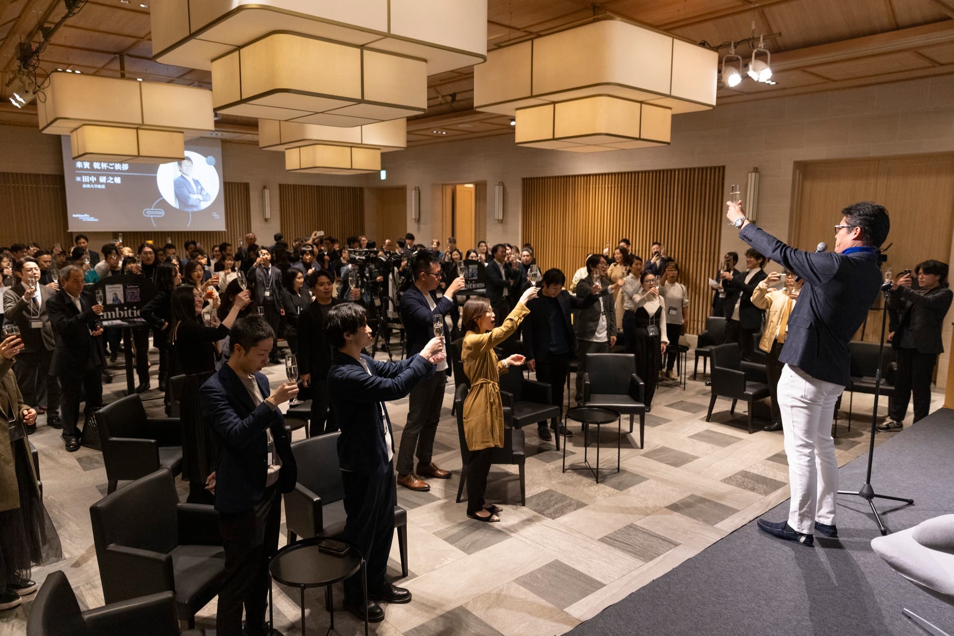 乾杯の音頭を取ったのは、法政大学教授の田中研之輔氏だ。乾杯酒として、海外からも注目を集める日本酒ブランド・SAKE HUNDREDの手がけるスパークリング日本酒「百光」が振る舞われた。ファウンダーの生駒龍史氏は、「百光のラベルに用いられている”吉祥文様”には、繁栄や長寿への祝いや願いが込められています」と説明した。