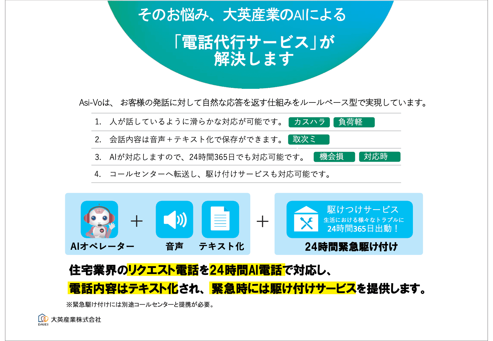 電話対応をAIが行うことで、24時間いつでも対応可能になります。緊急の場合は現地に出動しますし、そうでないものは担当者にテキスト化して正確に伝えます。効率化に加え、取次のミスを防ぎ、カスタマーハラスメント対策にもつながります。