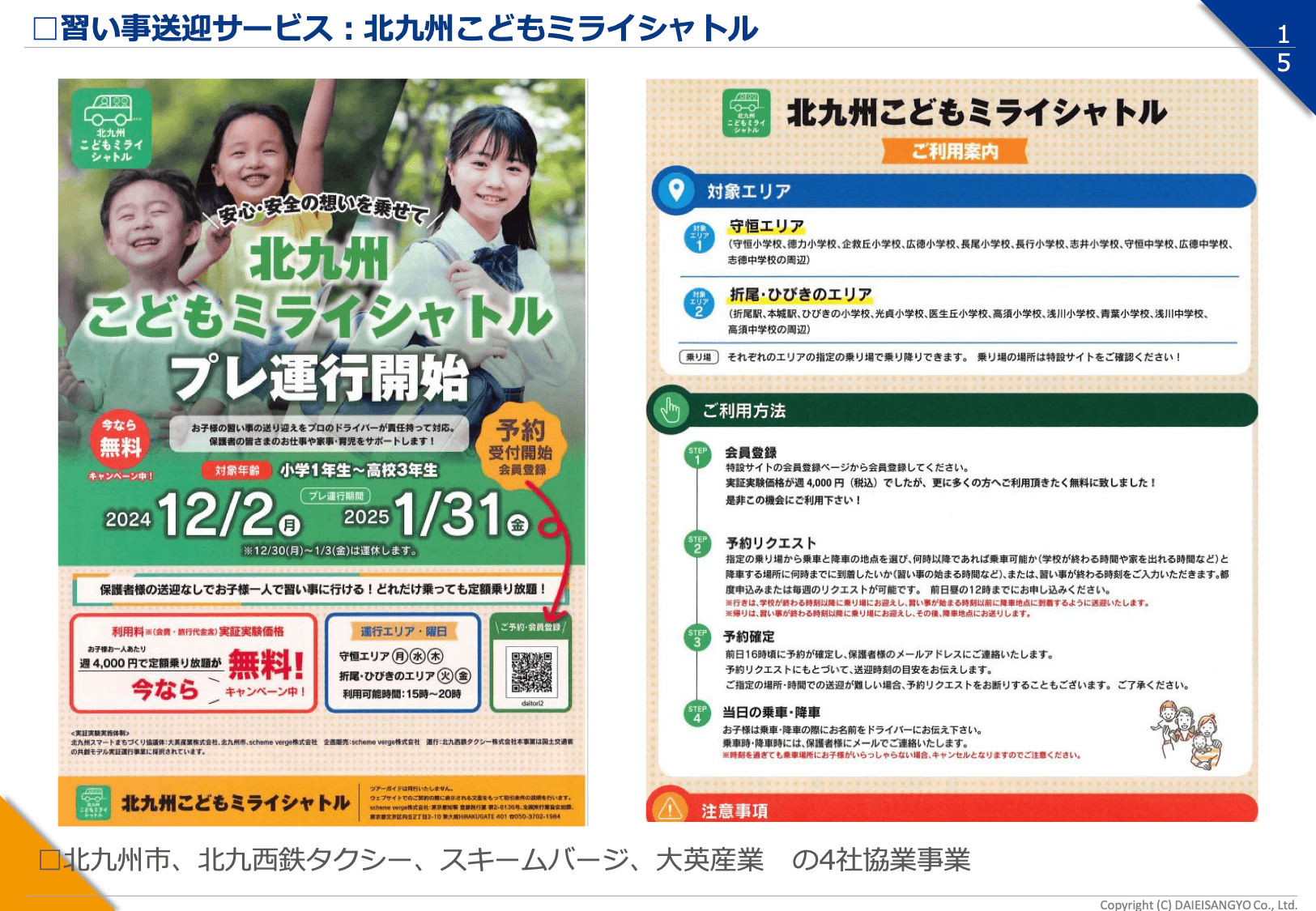 そこで、地場のタクシー会社や、子育て関連施設、北九州市などと連携し、サブスク型の習い事送迎サービス「北九州こどもミライシャトル」の実証実験を行ったのです。