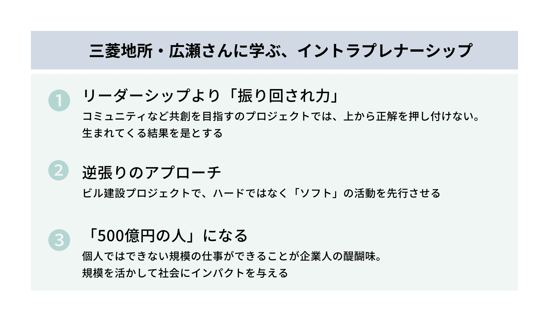 広瀬:できると思います。そのスキームをつくっていくのが、都市開発の醍醐味でもあります。そしてそれをやるべきは存在が、この土地に携わってきた三菱地所なのです。