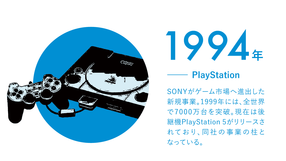 1994年に誕生し、後に「世界で最も売れた家庭用ゲーム機」となった、ゲーム業界のイノベーションです。開発の中心人物は、後に同社の副社長兼COOを務めることになる久夛良木健氏。当時の社長は大賀典雄氏、同社の音楽ビジネスをリードしてきた存在です。
