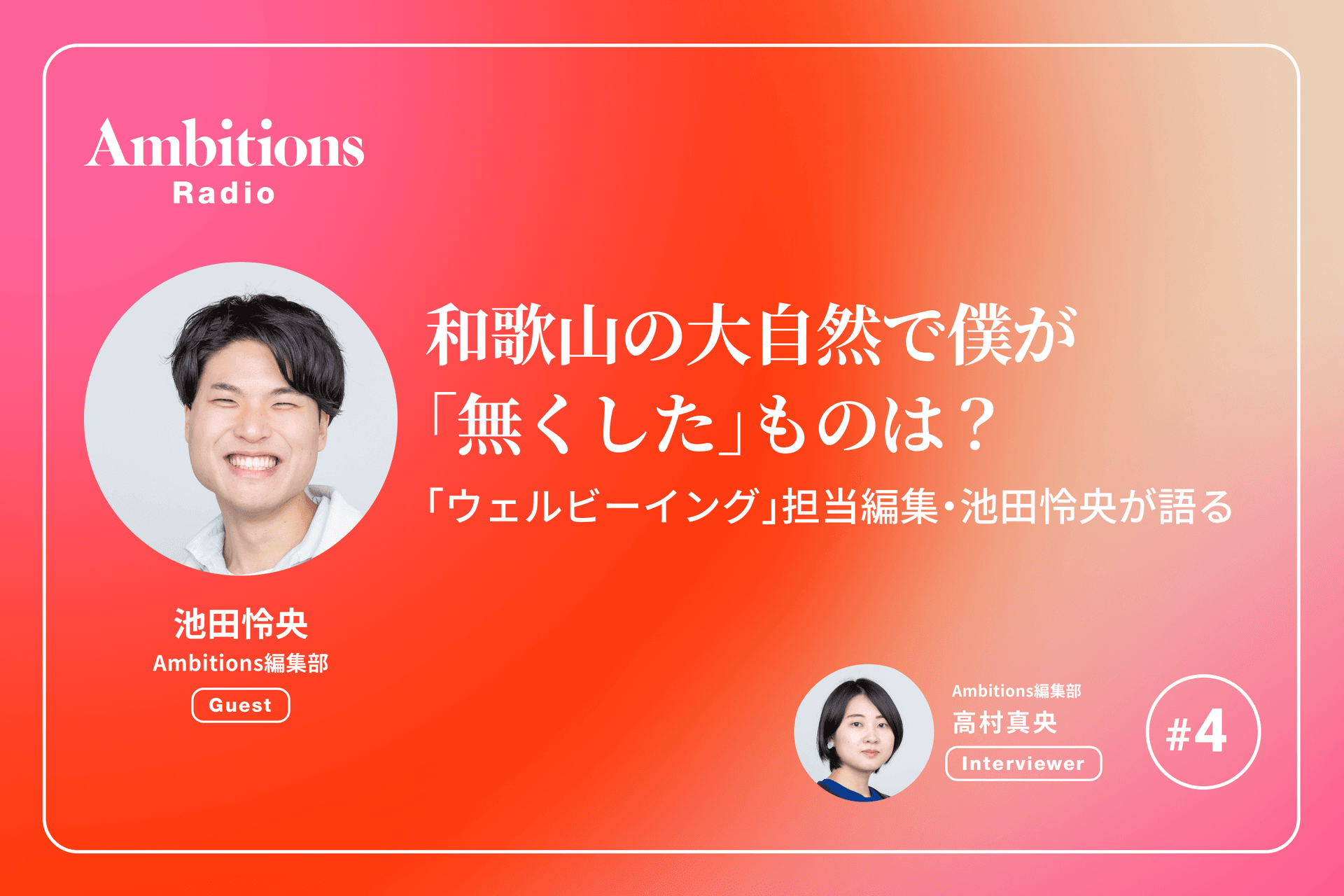 「Ambitions Vol.4」の発売を記念して、編集部メンバーによるPodcast番組を4話連続配信。 取材の裏話や誌面の狙いを、web限定でお届けします。 第4回は、第1特集内で、元ユニリーバ 取締役 島田由香氏への取材を担当した池田怜央。「ウェルビーイング」をテーマにしたイベント「和歌山 Well-Being Month」の体験を振り返ります。