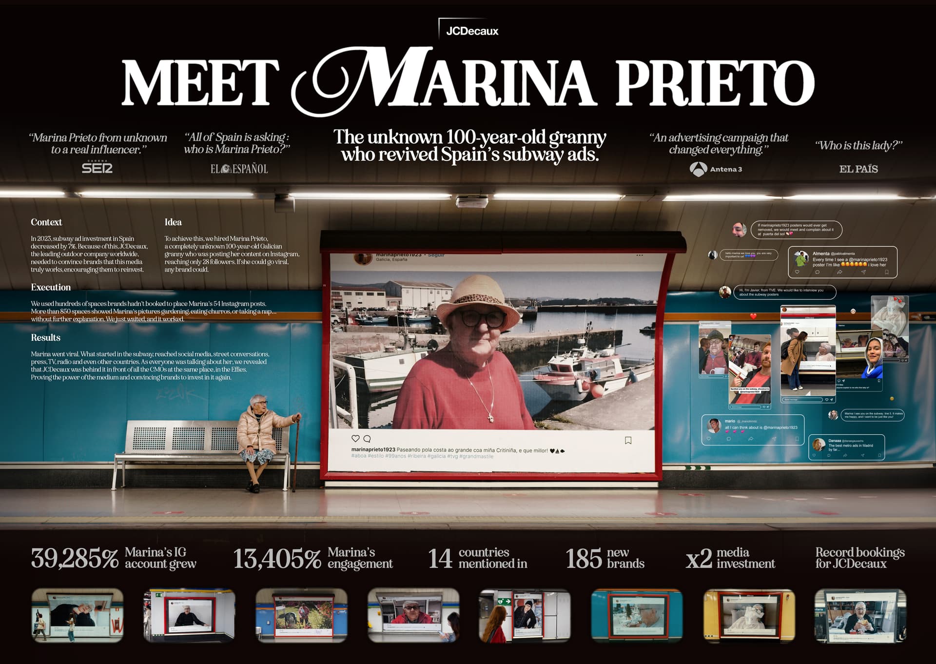 そこで地下鉄広告の威力を示すため、フランスに本社を置く世界的な広告代理店ジェーシードゥコー (JCDecaux)は世間にほとんど知られていない100歳の女性を起用しました。予算は限られていましたが、売れ残った地下鉄広告の空き枠を使って、2023年10月からマリーナ・プリエトのインスタグラム投稿54件を用いて「MEET MARINA PRIETO」と題したキャンペーンを行ったのです。