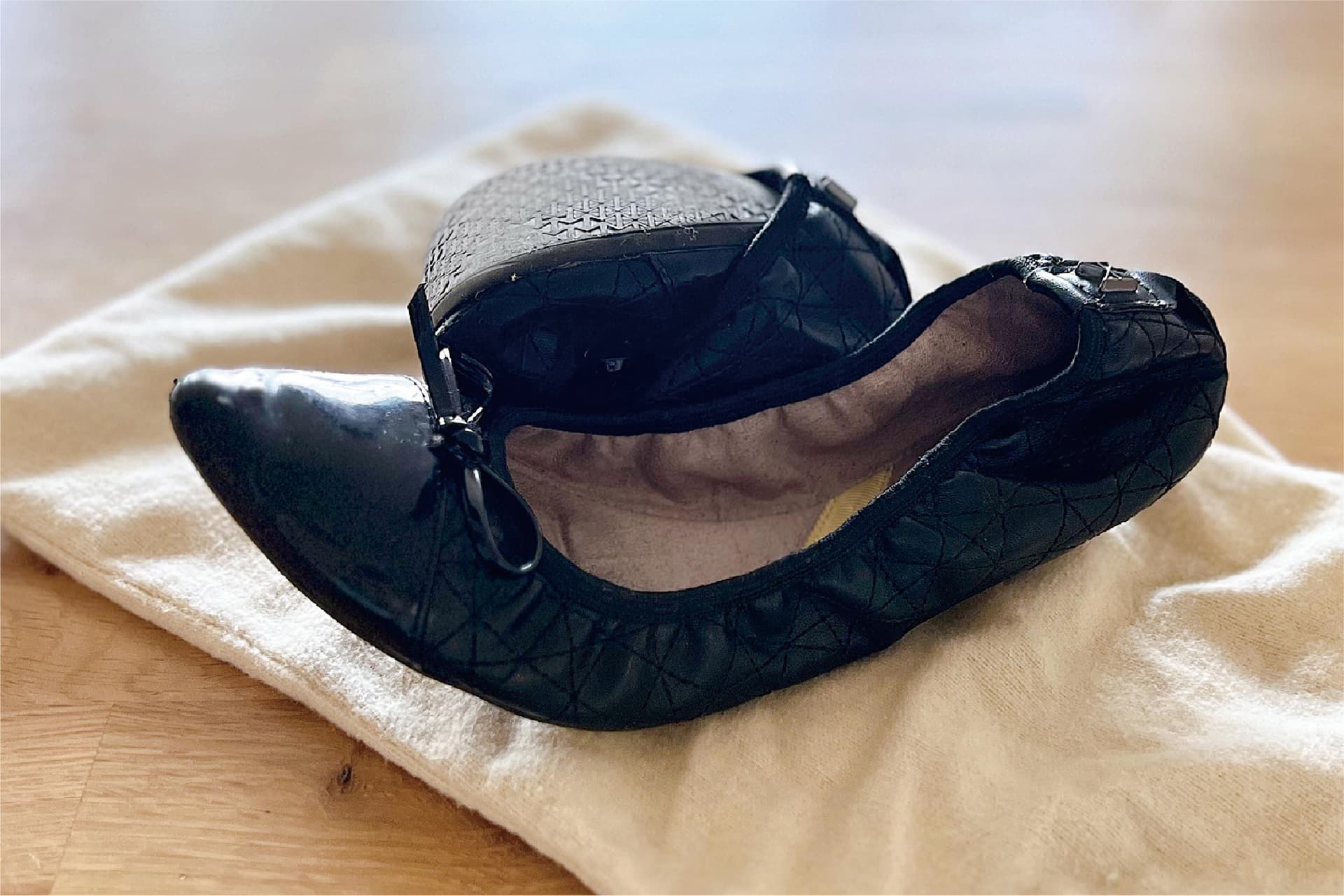 細川:我が家の旅のスタイルは、出張と家族旅行を一度に行うこと。だから、家族4人分の荷物をどうコンパクトにまとめるかが重要です。例えば、真ん中で折りたためるパンプス。ビジネスの場では必要だけど、娘たちと移動する時はスニーカーを履きたい。とはいえ、荷物は減らしたい……。そんな時、旅行かばんの中に簡単に入れられる折りたたみパンプスは重宝しています。