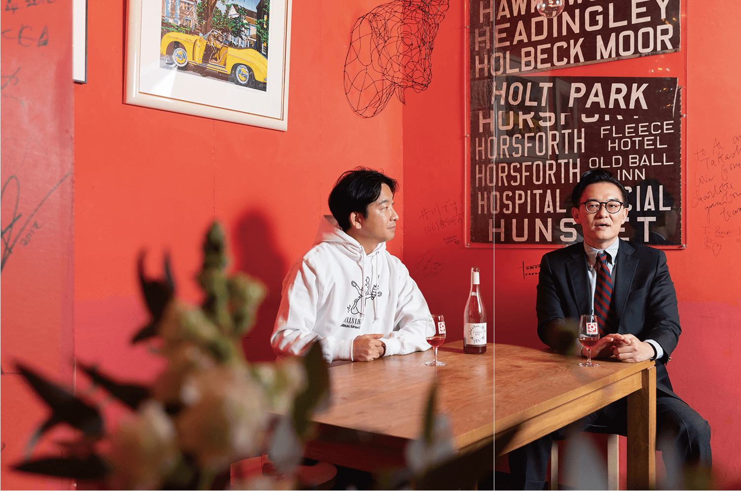 産業医の大室正志氏と、アニマルスピリッツ代表パートナーの朝倉祐介氏。飲み仲間であり、ともに音楽好き。その会話は音楽を入り口に、ファッションやワイン、文学、ビジネス、政治、社会など、あらゆる方面に展開していく。 ジャンルを問わない教養は、どのように培われたのか。大室氏、朝倉氏が知の探求を始めるに至ったきっかけが「系譜学」との出会いだ。好きなアーティストを基点に音楽の歴史を深掘りしていくなかで、「系譜」を意識するようになったという。そんな二人が、行きつけの東京・南青山のワインバー「赤い部屋」でアナログレコードを聴きながら語り合った。二人の“音楽放談”には、真の教養人になるためのヒントが詰まっている。