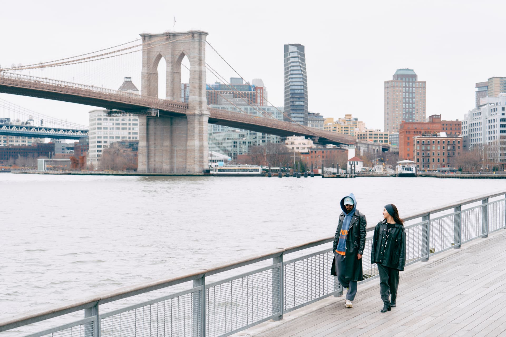 大橋 私のお気に入りの場所は、マンハッタン島の東側を流れるイーストリバーと、そこに架かるブルックリンブリッジとマンハッタンブリッジという2つの橋が見える、サウス・ストリート・シーポートというエリアです。公園の中には、机と椅子がたくさんあって、Wi-Fiまであるんです。寒い時期は、彼は本屋さんで仕事をしていますが、暖かい時期はふたりでランチをしながら、一緒に仕事ができてうれしいです。