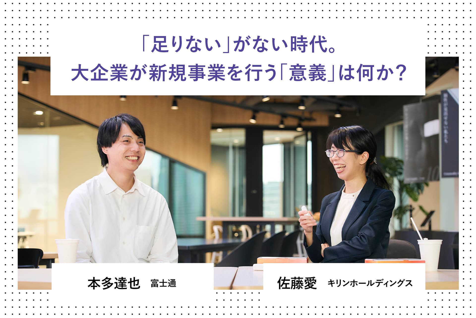 大企業に属しながら「新規事業」というスキームで社会課題の解決に挑む、富士通の本多達也氏とキリンの佐藤愛氏。 なぜ2人は社内起業を選び、そして「社会課題」に挑むのか。 若きソーシャル・イントラプレナーの対談から、大企業の新規事業の意義を掘り下げる。
