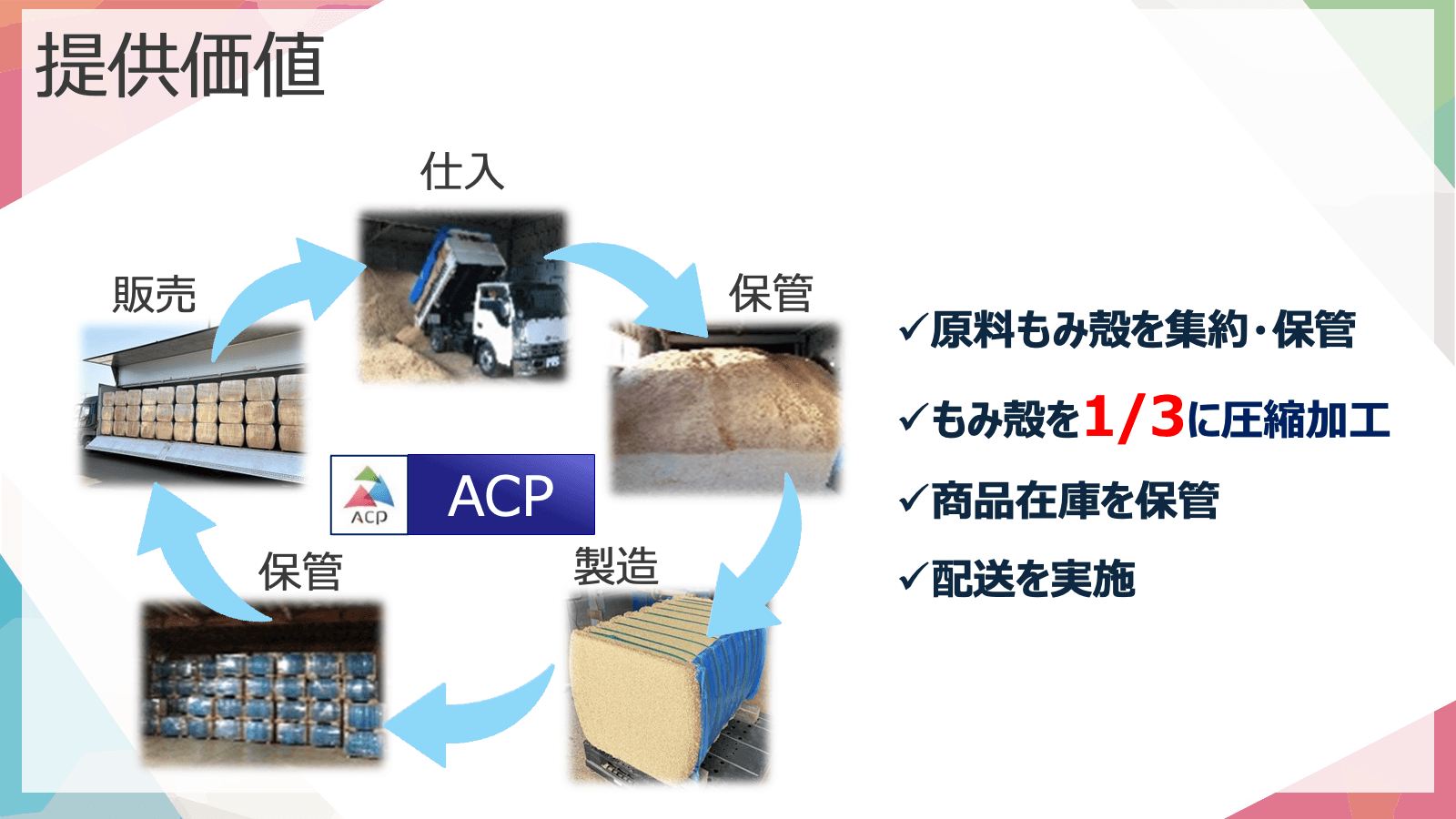 「事業は、稲作事業者の持ち込むもみ殻を受け入れることからスタートします。これにより稲作事業者は、計画的にもみ殻を処理することができます。その後、私たちが保管したもみ殻を特殊な技術で1/3にまで圧縮加工し、畜産事業者から依頼を受けたら、必要な量を通年で販売するのです。畜産業者にとっては、敷料の保管や運搬を私たちが担うことでリソースを削減できるのです」
