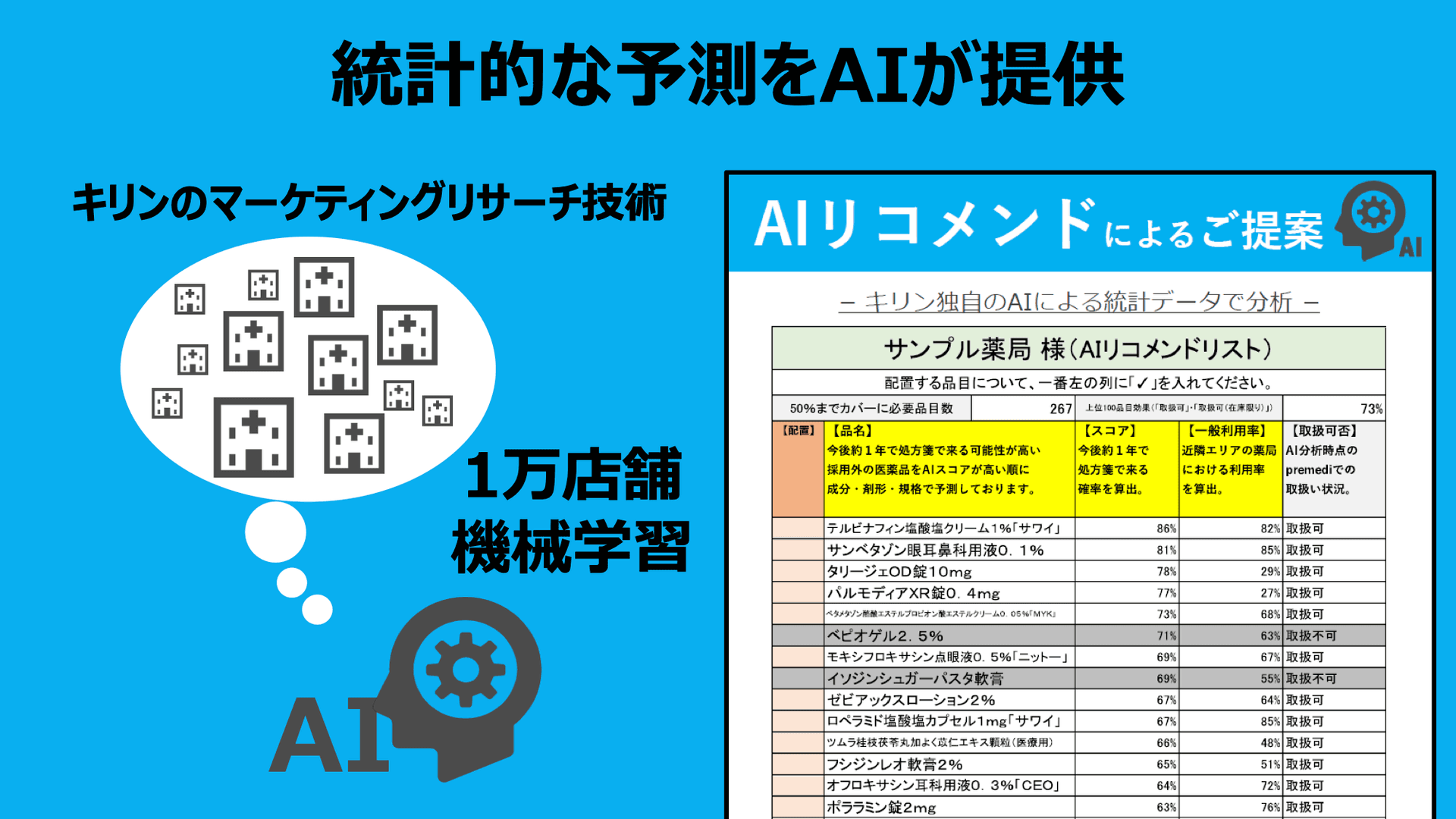 同時に、キリンのマーケティングリサーチ技術を使い、約1万店舗の処方データを機械学習させた独自のAIを開発し、薬局ごとに置くべき薬の情報を提供している。