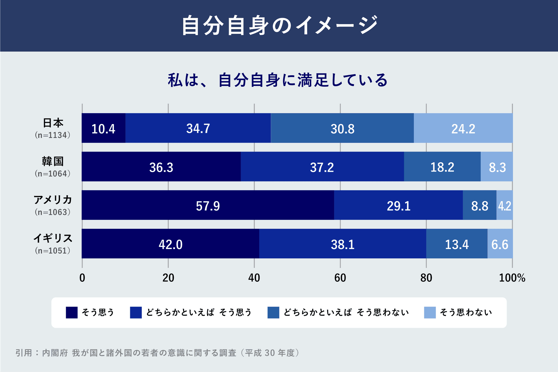 青砥 日本の若者が「自分に満足している」と答えた割合は、調査したほかの国(韓国、アメリカ、イギリス、ドイツ、フランス、スウェーデン)より低いものでした。