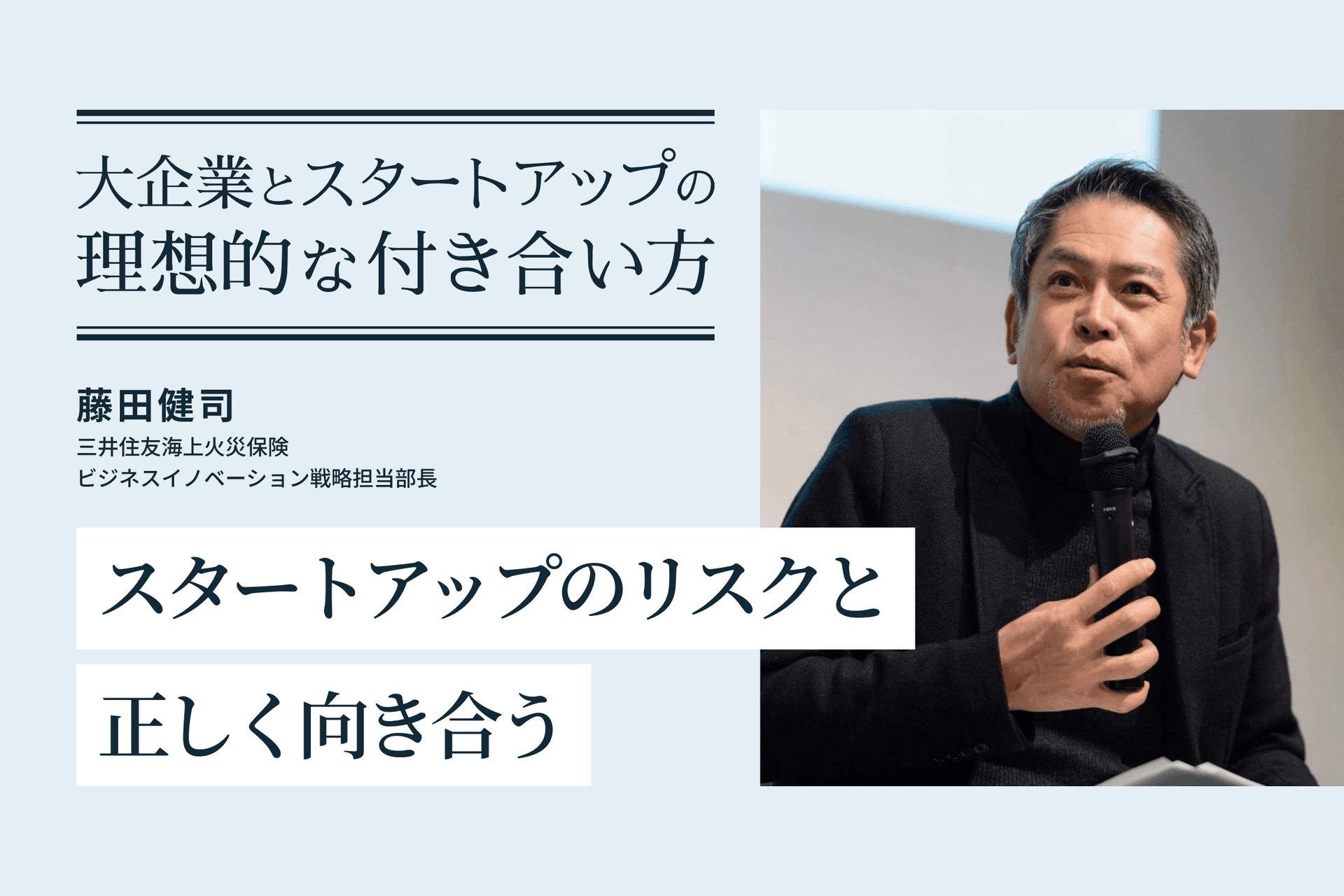 大企業とスタートアップが協業して事業開発を行う、オープンイノベーションの取り組みが増えている。大企業はどのようにスタートアップと付き合っていくべきか。また、どうすればスタートアップのよき理解者、ビジネスパートナーとなれるのか。三井住友海上火災保険でスタートアップ向け保険の開発などを手掛ける藤田健司氏に、大企業とスタートアップの理想的な付き合い方について話を聞いた。キーワードは「スタートアップのリスクアセスメント」だ。