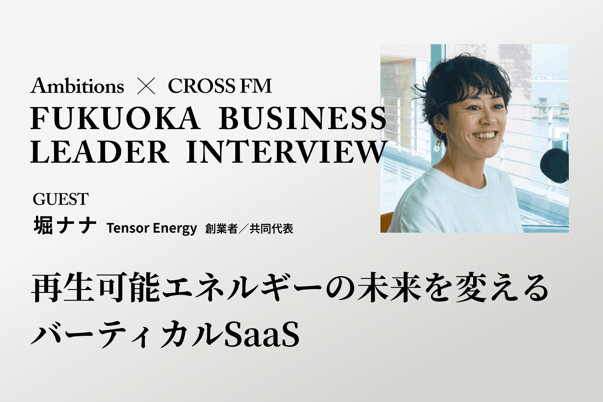 2050年のカーボンニュートラル実現に向け、国だけでなく、企業や消費者も再生可能エネルギー(以下、再エネ)に関心を寄せている。 しかし、要となる再エネ発電事業者に大きな壁が立ちはだかっていることを、知らない人も多いのではないだろうか。 福岡に拠点を構えるラジオ放送局CROSS FMと『Ambitions FUKUOKA』による共同コンテンツ。福岡を中心に日本全国、世界で活躍する経営者やビジネスパーソンをゲストに迎え、ビジネスモデルや起業の原点についてインタビューを行う。 本記事では「持続可能なエネルギーを必要な時に必要なところへ」をビジョンに掲げ、福岡市を拠点に活動する、Tensor Energy(テンサーエナジー)株式会社の創業者兼共同代表・堀ナナ氏をゲストに迎える。