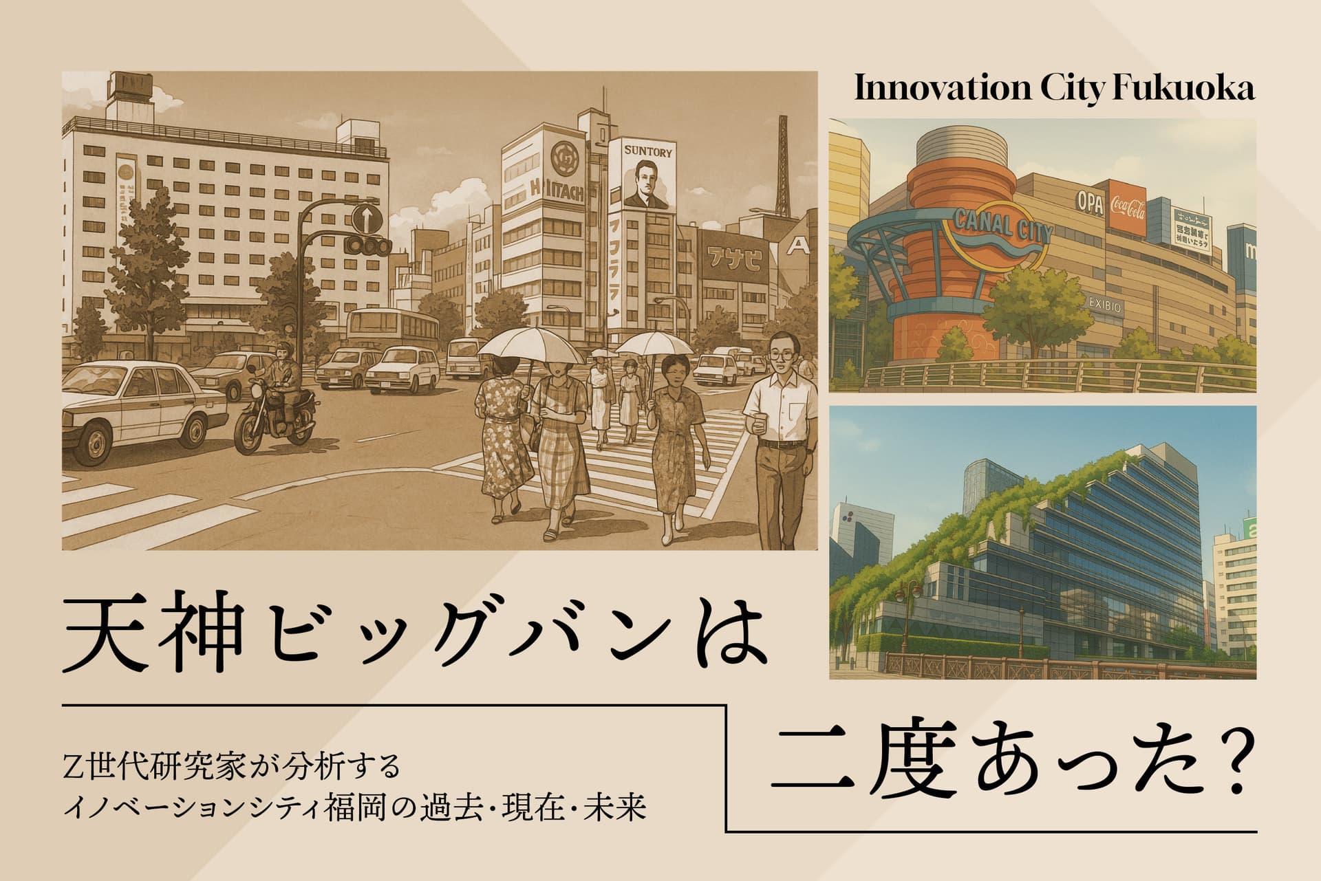 天神のビッグバンは2度目だった――。 約60年前、1度目のビッグバンが起きた天神周辺エリアは、経済成長と自然の美しさの両方を大切に独自の都市成長を遂げた。そして現在、2度目のビッグバンにより街は大きく変化しつつある。 国内外企業や外資系ホテルの誘致が進み、スタートアップやスモールビジネス、個人店などあらゆるプレーヤーが共存・”染み出し”ながら、福岡市を彩っている。 そんな福岡市の過去と現在、そして未来について、九州大学大学院とURBANIX株式会社で都市研究を続ける岩淵丈和氏が分析する。