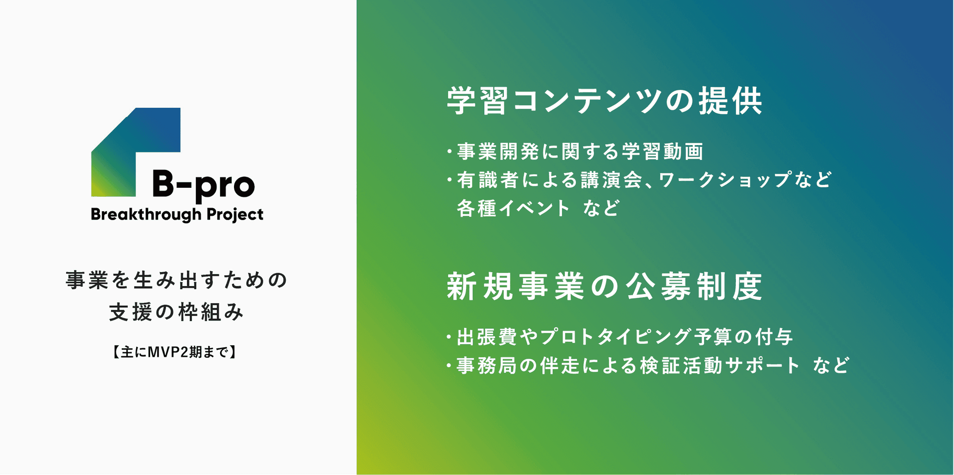 実際に新規事業を生み出す手段の1つとしては、社員から新規事業の種を公募する「B-pro(Breakthrough Project)」を実施しています。これには毎年数百件の応募があり、各社員の情熱が詰まったアイデアが集まります。書類・面談審査を経て、複数回の審査会を突破した2~3件の事業案が事業検証の段階に進みます。