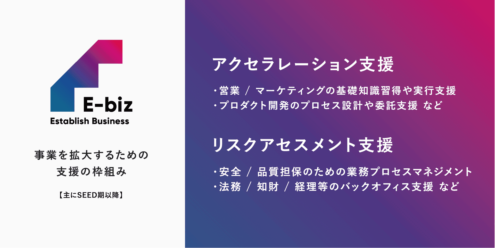 事業性を検証するフェーズでは、実際に商品・サービスを売ることとなります。ここでは、営業・マーケティングからカスタマーサポートまで、やるべきことが広がるため、「E-biz(Establish Business)」という支援を構築しています。コーポレート部門とも連携し、少人数の起案チームで事業推進できるように組織的な体制を組み、サポートしています。