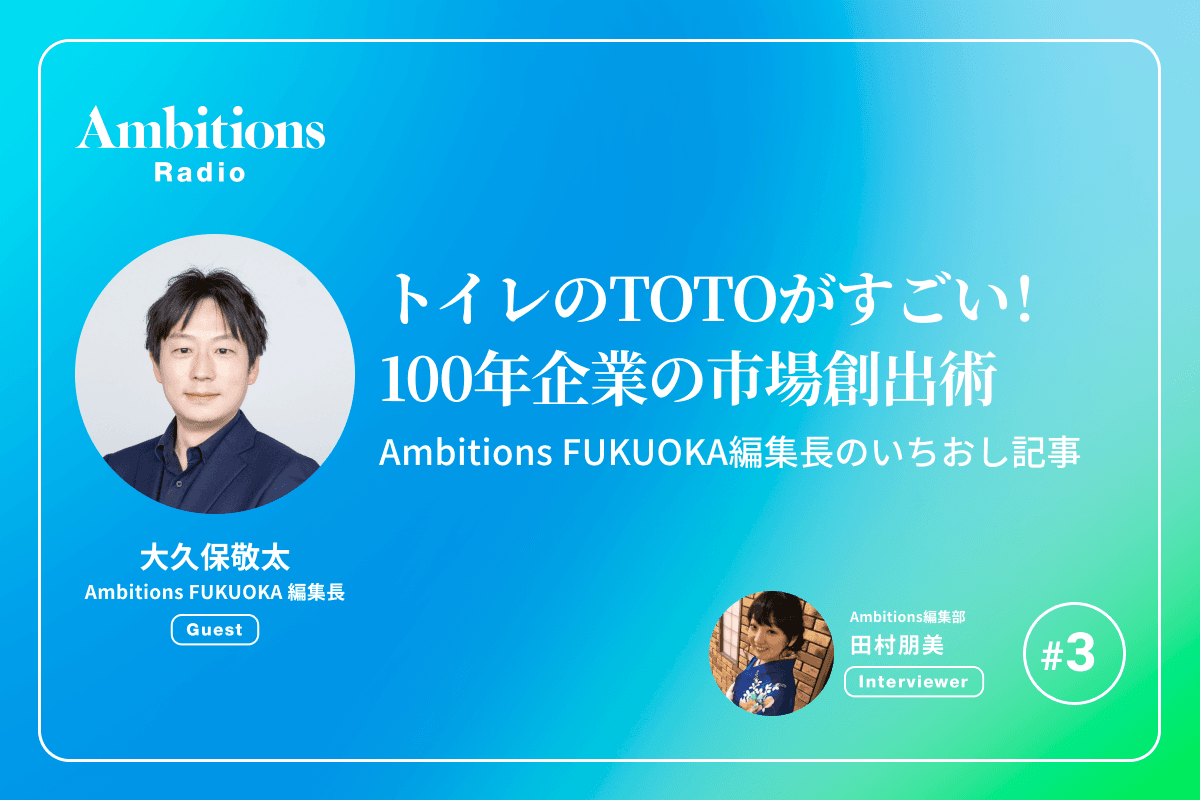 「Ambitions FUKUOKA Vol.2」の発売を記念して、編集部メンバーによるPodcast番組を3話連続配信。 取材の裏話や誌面の狙いを、web限定でお届けします。 第一回は編集長の大久保敬太。 数ある企画の中で「もっともテンションが上がった」というTOTOトップインタビューについて、取材の裏話を熱弁します。