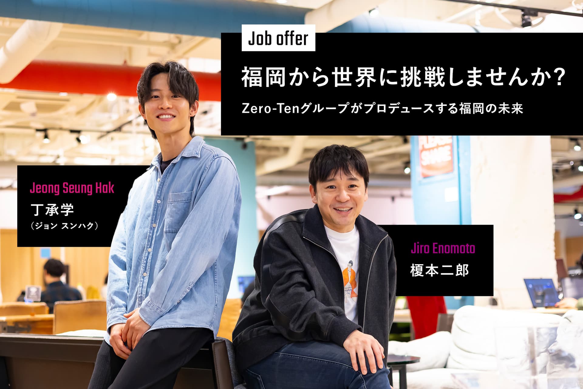 福岡が好き。福岡で働きたい。 ──そう思う人は少なくないが、ワクワクするような面白い仕事を見つけられないと嘆く人は多い。そこで福岡でのUIJターンや就職・転職を考えている人に挑戦してほしいのが、アートや文化によるまちづくりと、コミュニティ運営やスタートアップ支援などによるビジネス創出を力強く推進しているプロデューサー集団、Zero-Ten/Zero-Ten Parkだ。福岡に面白い未来を仕掛けている代表取締役の榎本二郎氏と、事業プロデューサーの丁承学氏に、仕事の醍醐味を伺った。