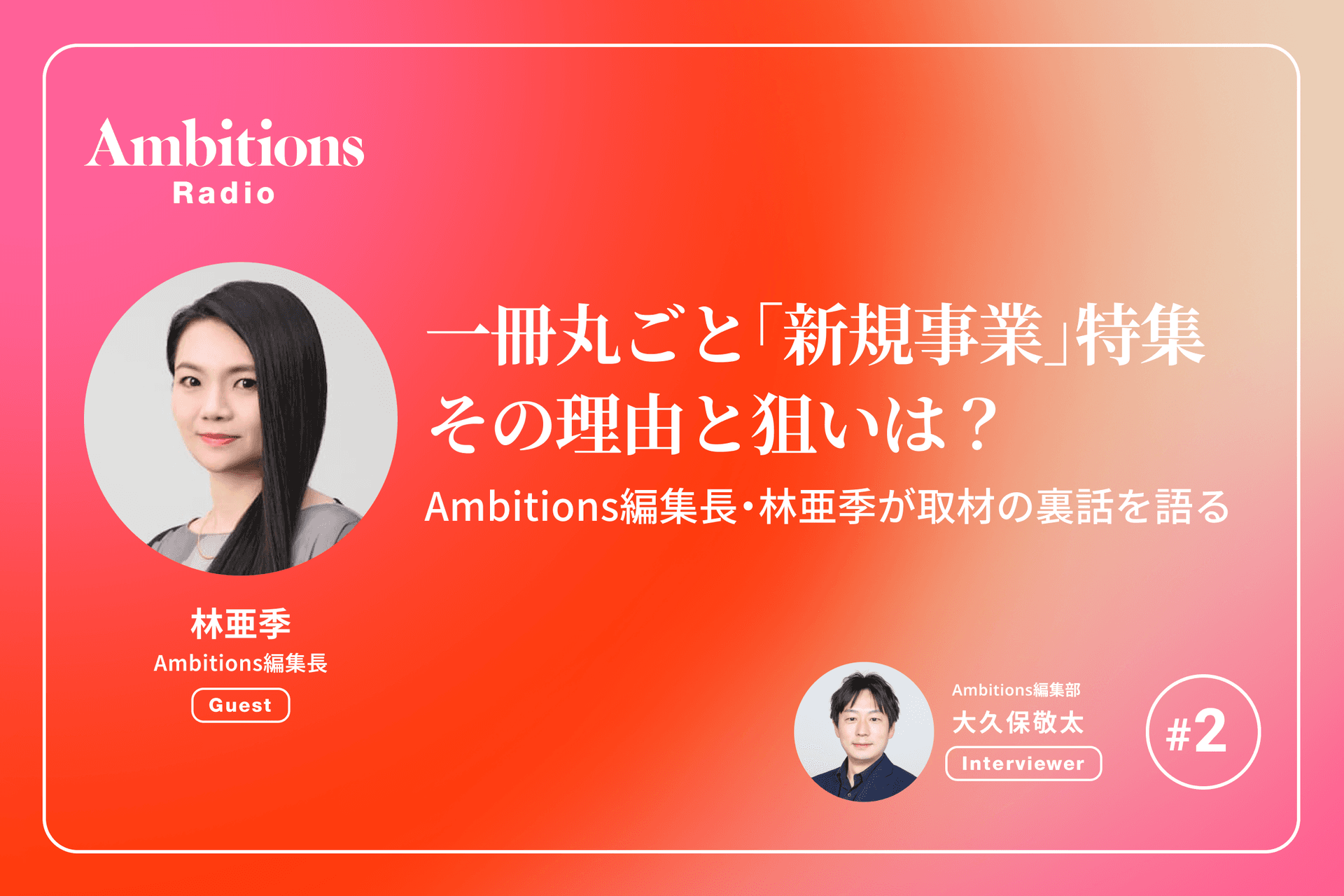 「Ambitions Vol.4」の発売を記念して、編集部メンバーによるPodcast番組を4話連続配信。 取材の裏話や誌面の狙いを、web限定でお届けします。 第3回は、Ambitionsを代表する連載企画である「大・企業人」を担当する高村真央が登場。 日本経済を支える大企業、その中でビジネスに取り組む人(=大・企業人)。現代の日本企業をサバイブする彼ら、彼女らの本音とその魅力に迫った、取材の裏側を話します。